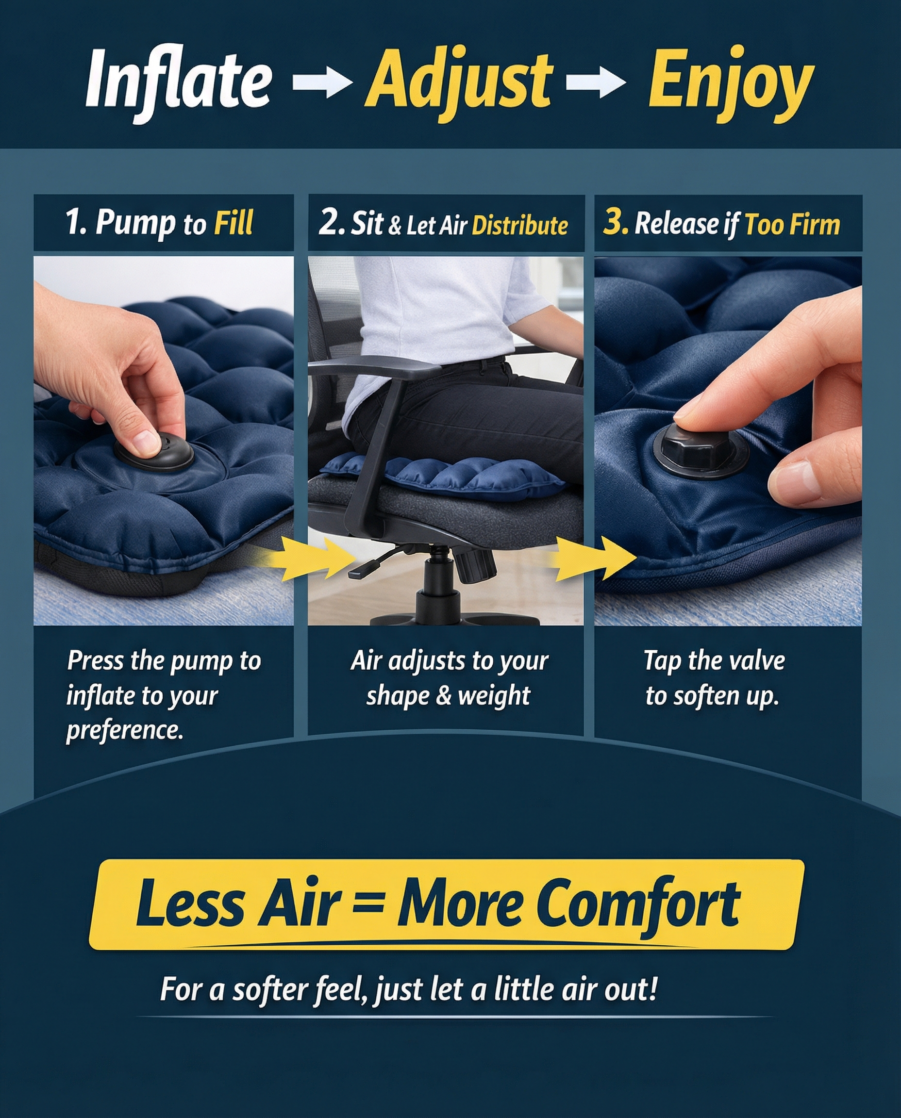 Air pockets move as you move, spreading your weight and easing pressure where it hurts most. The open design helps keep you cool, and you can add or release air to get the comfort just right. Your seat, your way.