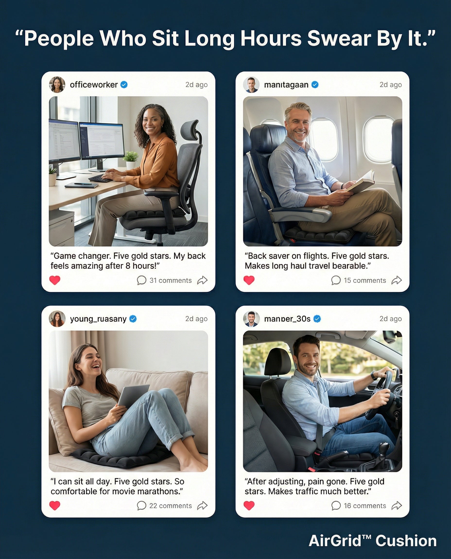 Long commutes and desk work used to wreck my hips. This cushion removes pressure and keeps me comfortable for hours, seriously helpful