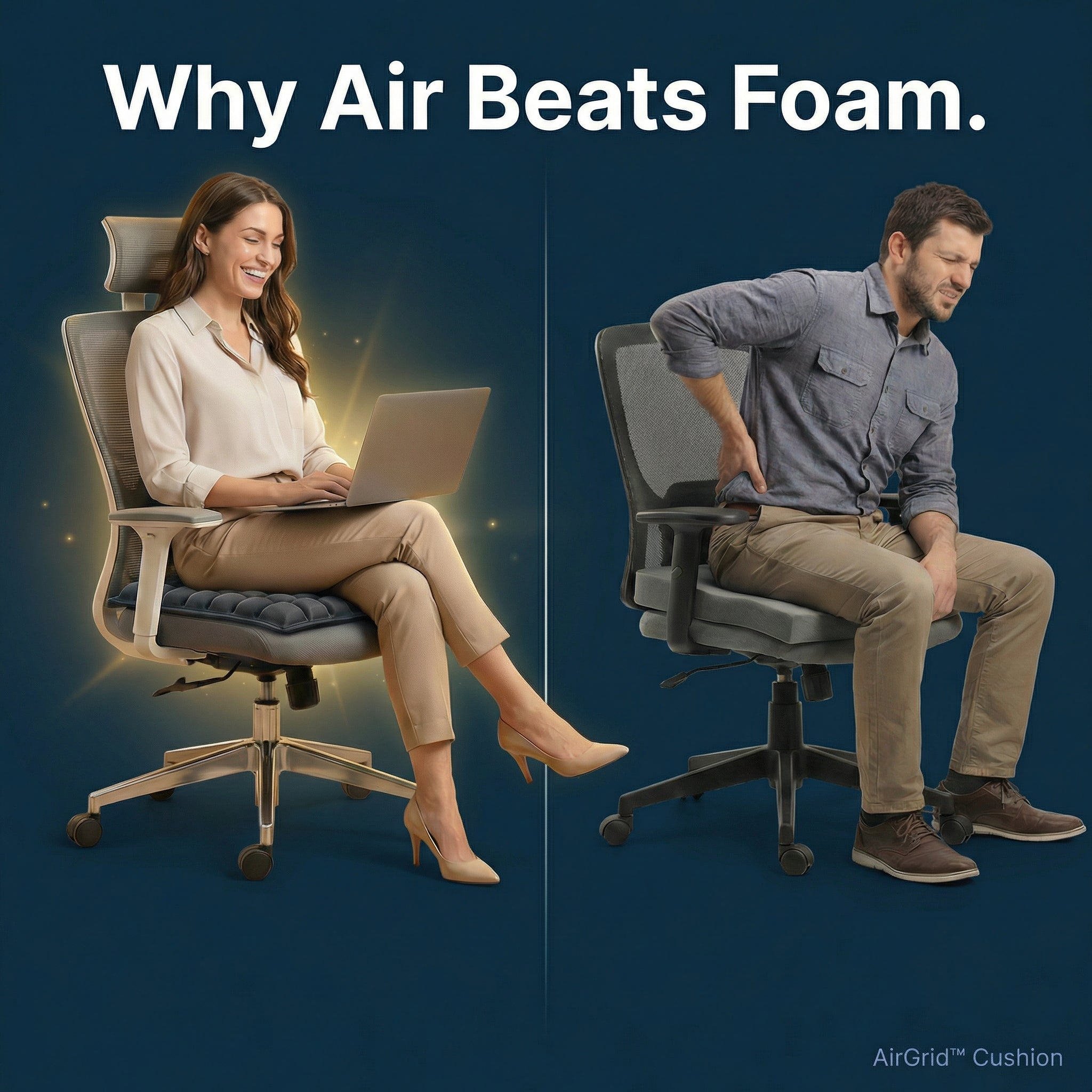 Long day. Tight lower back. Hips numb. Tailbone burning. You keep shifting, chasing comfort that never comes while the seat gets hotter. By the time you stand up — or land — you’re already drained.